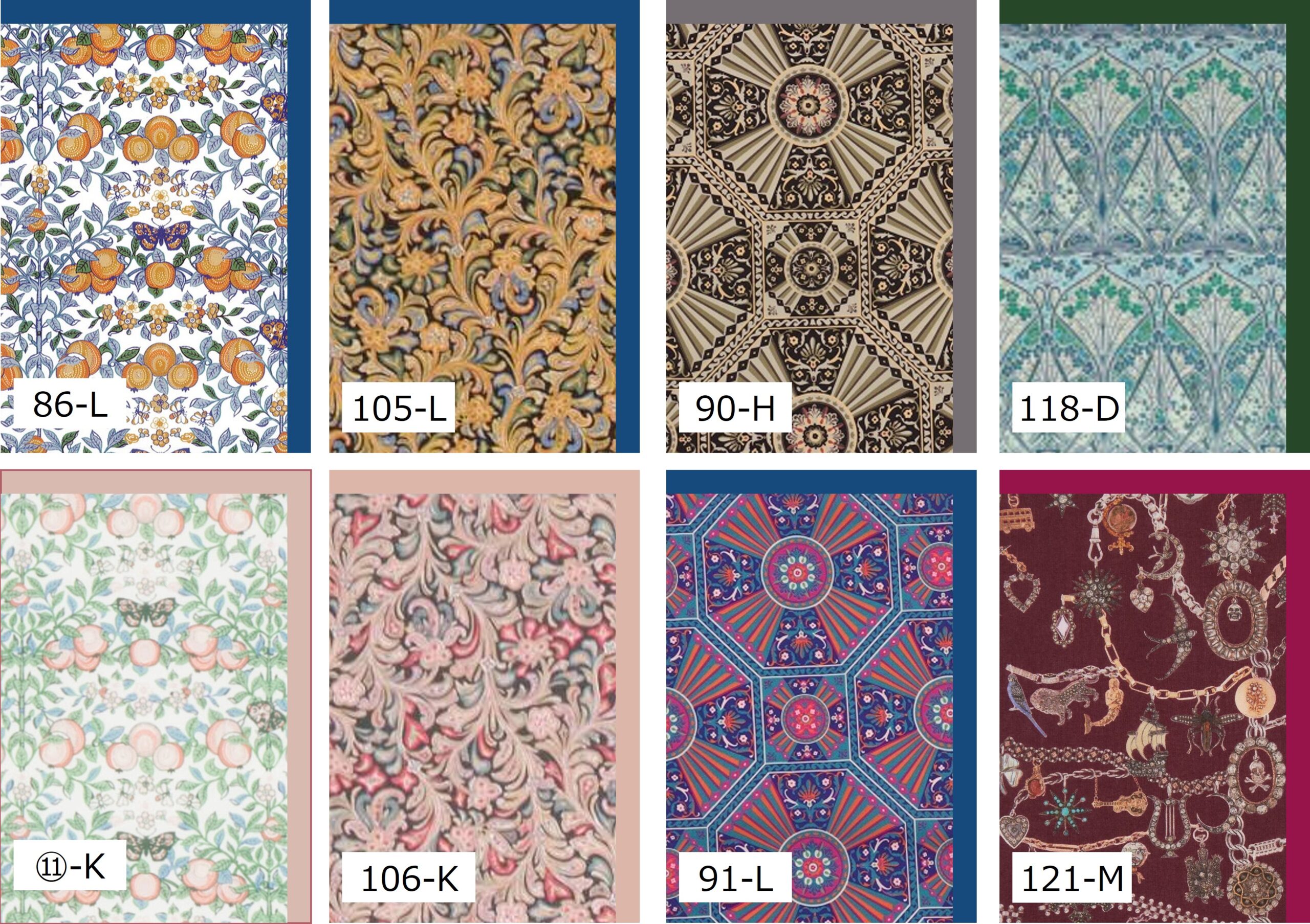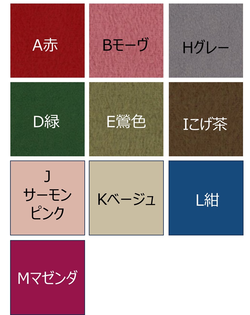 キットには、1-Aなどの番号がついています。初めの数字が布の番号、あとの記号が内箱などの起毛紙・布番号です。内側の素材を他の色にしたい場合は、1-Mなどのように、一番下の画像のアルファベットをご指定下さい(A~Iは起毛紙、J以降は布です)
