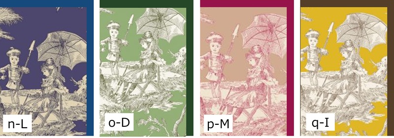 -生地は、通常のリバティの生地は薄いので、貼るのに少しコツが要ります(しわに気を付けて貼ったり、シミに気を付けてボンドの量を調節する必要があります)。貼りやすいのは、①~④のブラザーラビットの生地(こちらはリバティではなくmodaファブリックの生地です)や、a~qのトワルドジュイの生地です。s1~4やe1の生地も扱いやすい厚みです。逆に、k1~4の川島織物の生地は、接着しづらいのと厚みがあるので、難しくなります。