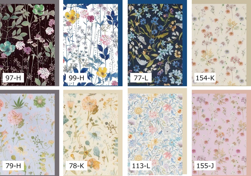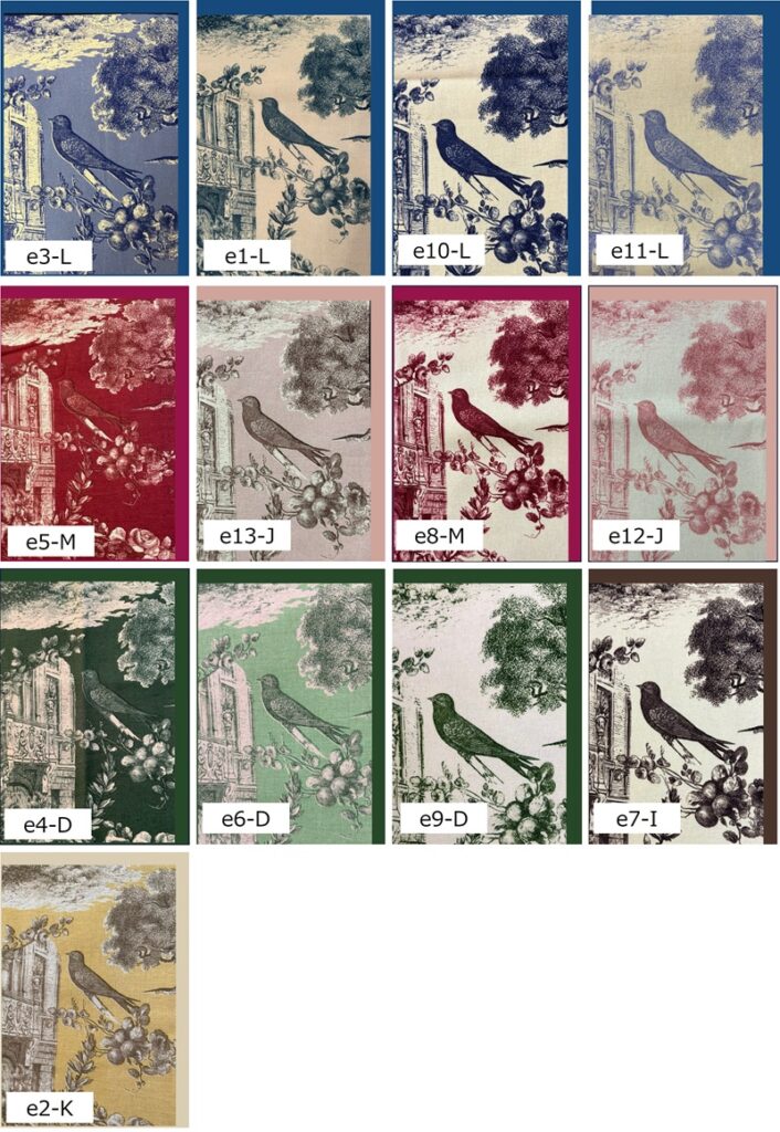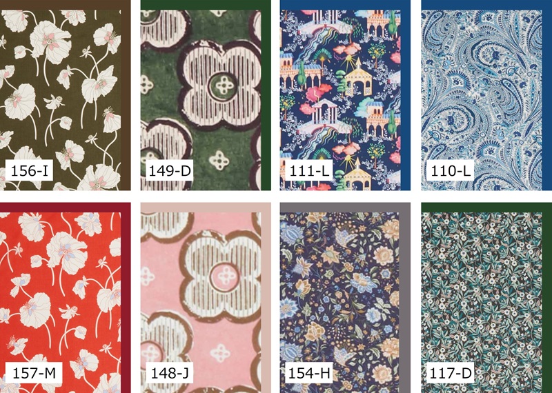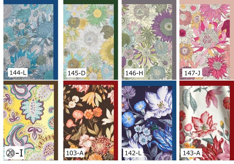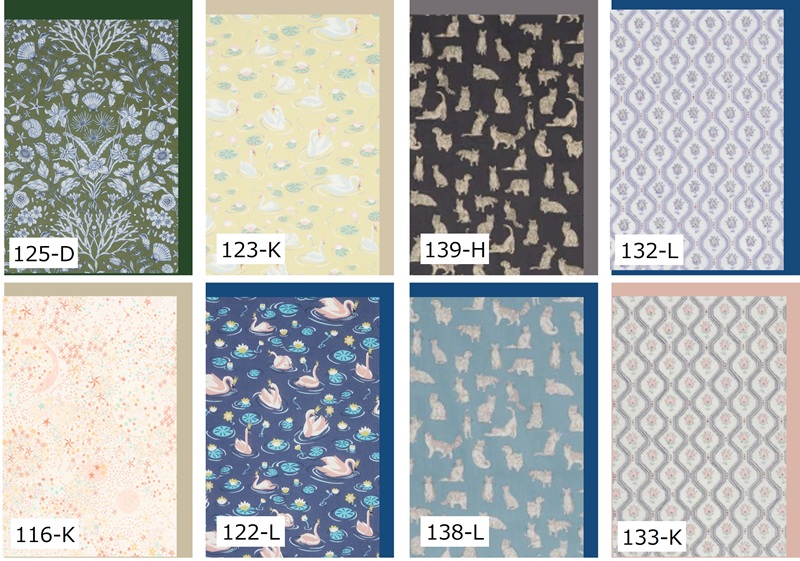 -生地は、通常のリバティの生地は薄いので、貼るのに少しコツが要ります(しわに気を付けて貼ったり、シミに気を付けてボンドの量を調節する必要があります)。貼りやすいのは、①~④のブラザーラビットの生地(こちらはリバティではなくmodaファブリックの生地です)や、a~qのトワルドジュイの生地です。s1~4やe1の生地も扱いやすい厚みです。逆に、k1~4の川島織物の生地は、接着しづらいのと厚みがあるので、難しくなります。